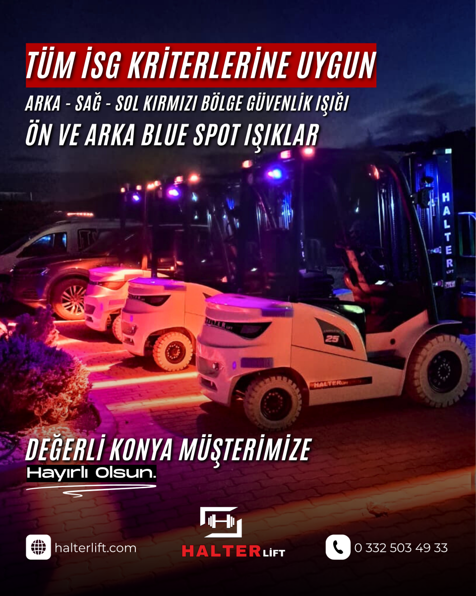 Süspansiyonlu Grammer koltuk, integral kaydırma tablası, ön ve arka blue spot ile kırmızı güvenlik ışıkları, iz yapmayan beyaz dolgu teker ve geri vites kornası gibi donanımlarıyla tüm İSG kriterlerine uygun, dar alanlarda yüksek manevra kabiliyeti sağlayan Halterlift E Serisi lityum akülü forkliftler, Konya’daki işletmeler için sessiz, çevreci ve uzun ömürlü bir yatırım olmaya devam etmektedir.